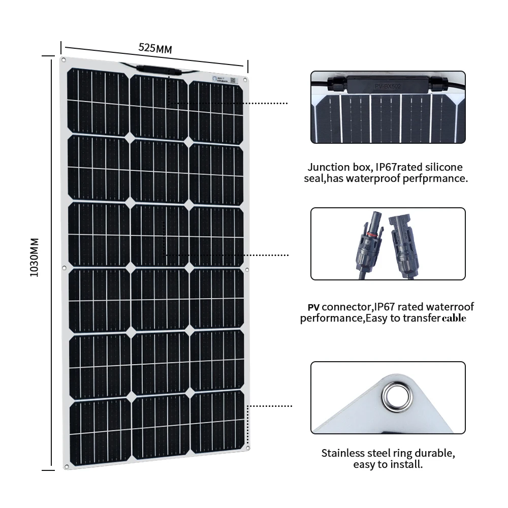 Product Name: Panel Surya Fleksibel 100W 18V 12V Pengisi Daya Surya Monokristalin Untuk 1000W Sistem Perlengkapan Rumah Mobil RV Perahu Pengisi Daya Baterai Tahan Air